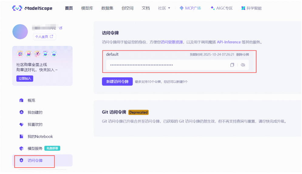 注册完后,可在此页面查看访问令牌:https://www.modelscope.cn/my/myaccesstoken