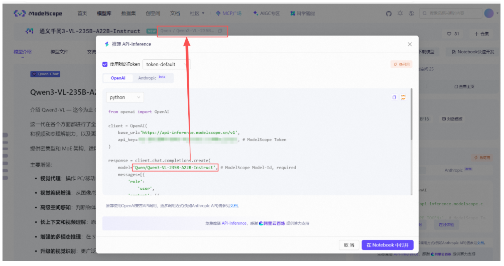 可以点击在Notebook中打开直接使用ModelScope提供的免费服务器打开,或者将代码复制到本地的Notebook打开。