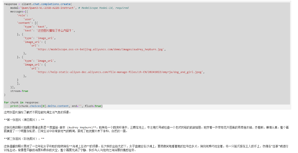 response = client.chat.completions.create( model='Qwen/Qwen3-VL-235B-A22B-Instruct', # ModelScope Model-Id, required messages=[{ 'role': 'user', 'content': [{ 'type': 'text', 'text': '这些图片描绘了什么内容?', }, { 'type': 'image_url', 'image_url': { 'url': 'https://modelscope.oss-cn-beijing.aliyuncs.com/demo/images/audrey_hepburn.jpg', }, }, { 'type': 'image_url', 'image_url': { 'url': 'https://help-static-aliyun-doc.aliyuncs.com/file-manage-files/zh-CN/20241022/emyrja/dog_and_girl.jpeg', }, } ], }], stream=True)for chunk in response: print(chunk.choices[0].delta.content, end='', flush=True)