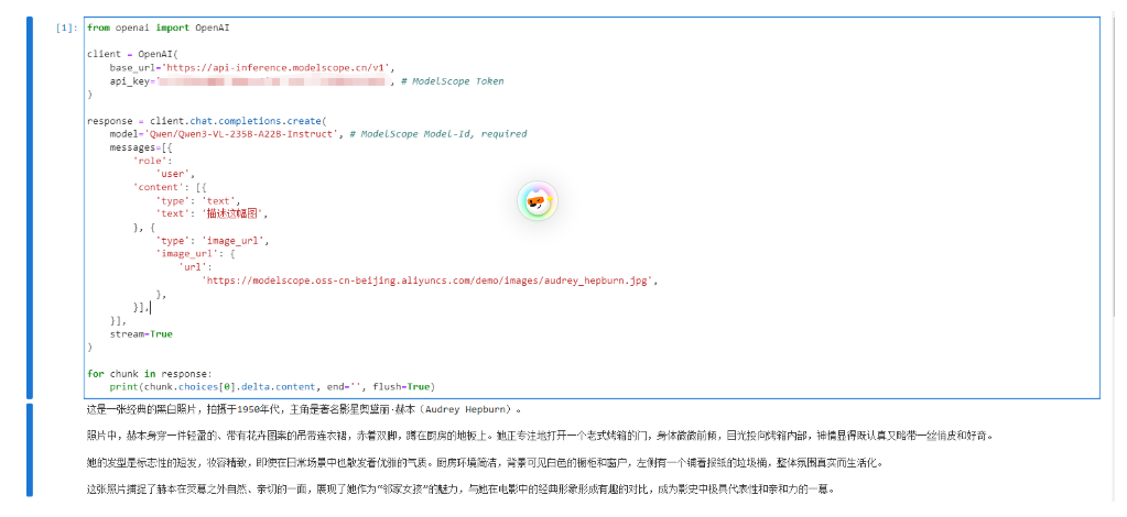 from openai import OpenAIclient = OpenAI( base_url='https://api-inference.modelscope.cn/v1', api_key='YOUR_API_KEY', # ModelScope Token)response = client.chat.completions.create( model='Qwen/Qwen3-VL-235B-A22B-Instruct', # ModelScope Model-Id, required messages=[{ 'role': 'user', 'content': [{ 'type': 'text', 'text': '描述这幅图', }, { 'type': 'image_url', 'image_url': { 'url': 'https://modelscope.oss-cn-beijing.aliyuncs.com/demo/images/audrey_hepburn.jpg', }, }], }], stream=True)for chunk in response: print(chunk.choices[0].delta.content, end='', flush=True)