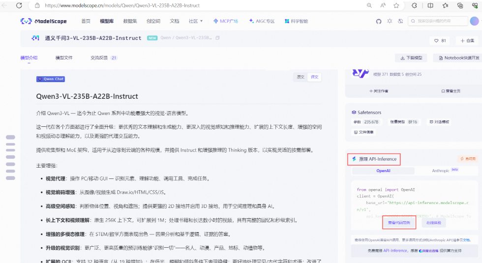 可通过右侧的推理API-Inference查看代码示例或者在线体验。