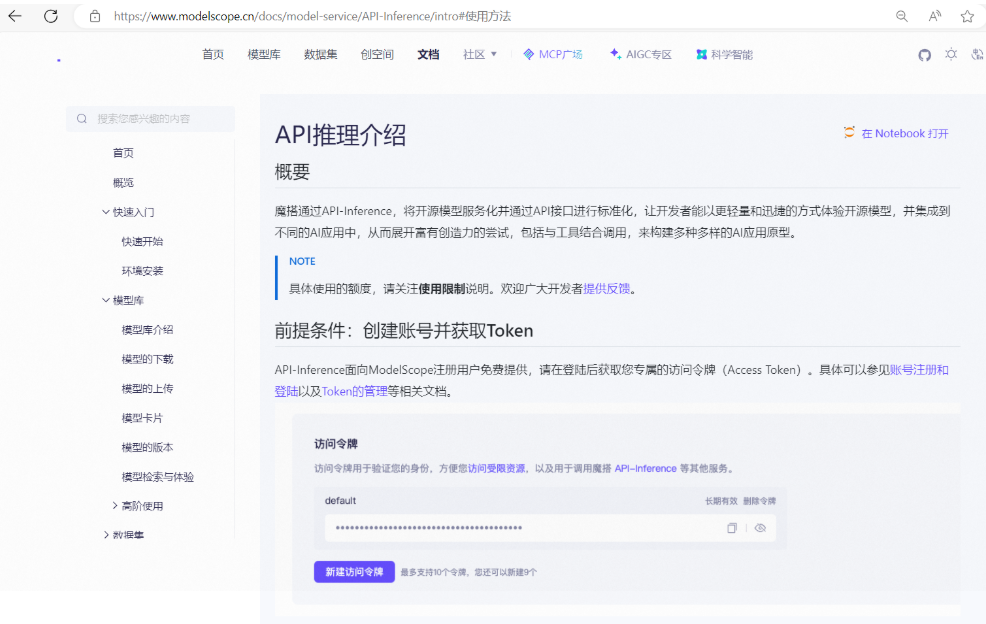 关于API推理的介绍和使用可以查看该网址:https://www.modelscope.cn/docs/model-service/API-Inference/intro#%E4%BD%BF%E7%94%A8%E6%96%B9%E6%B3%95