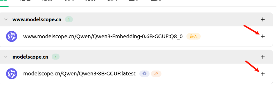 填写好之后,第三步点击管理按钮就可以看到当前的模型列表,我们把安装的两个都点击右侧加号添加进去。