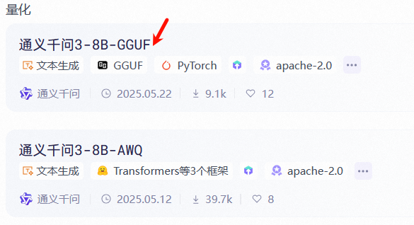 点开之后你会发现这个量化列表的模型中,排在第一位的就是带有GGUF格式的模型,我们点入GGUF模型的主页。