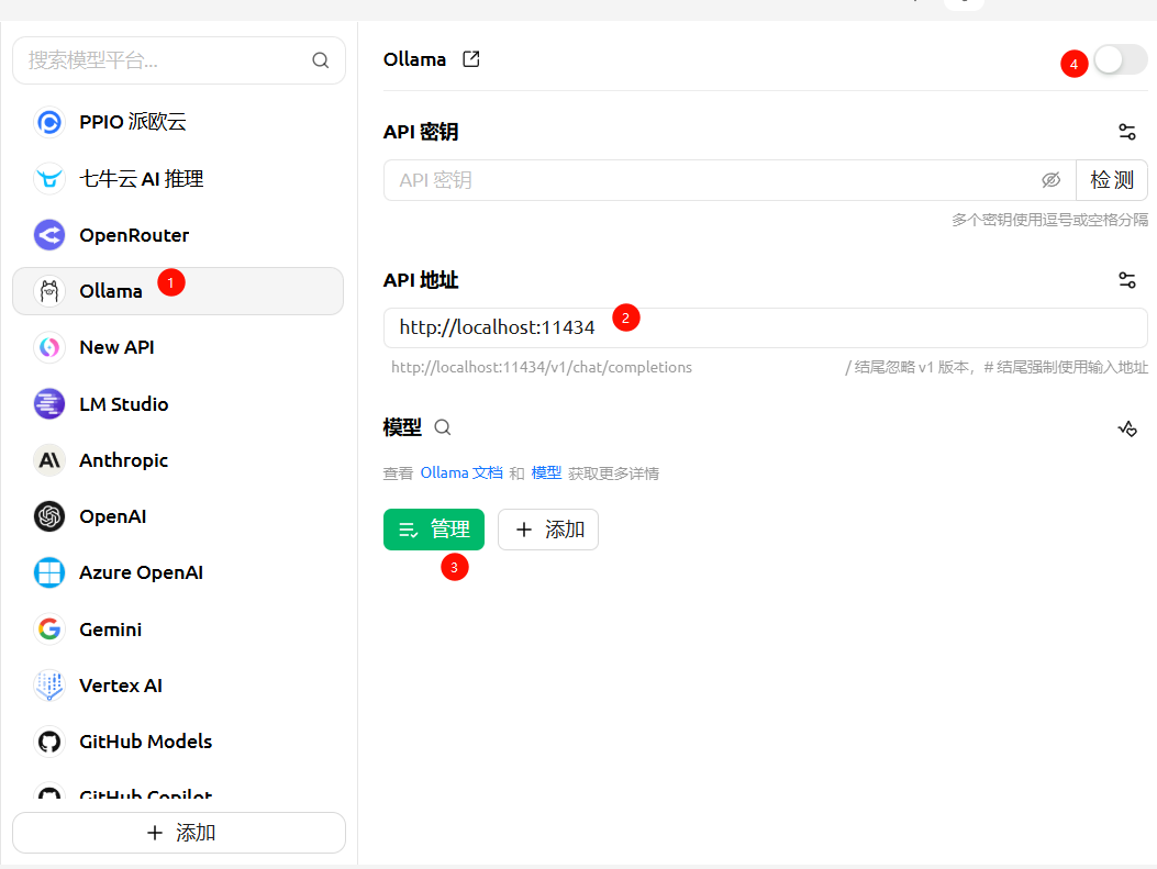 首先第一步选择模型的平台为ollama,然后第二部填写api地址为,注意这里的api密钥可以不用填写的,因为毕竟是自己电脑本地的模型:
