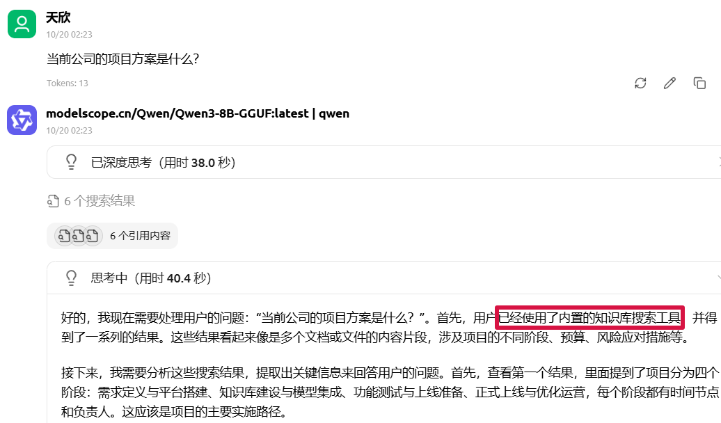 这时候你就可以断开网络,使用ai来和你进行知识库的问答了,比如我这里问他公司的项目是什么,可以看到他对知识库的内容做了引用。