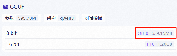 我们在模型的首页可以看到,这里的:Q8_0就代表了拉取的是8bit量化的,这样占用显存更少的同时也能有不错的准确度。