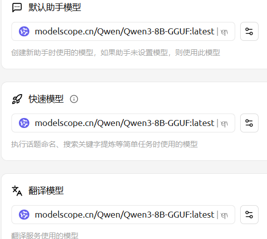 第四步一定要点击右上角的按钮,把它开启。接下来我们就让添加好的模型作为我们默认使用的模型,点击左侧配置栏的默认模型按钮,统一配置默认为qwen3-8b。
