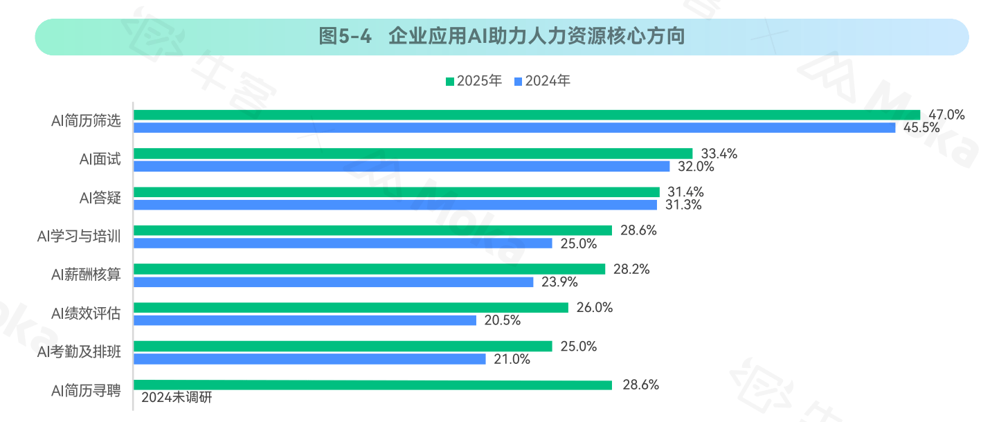 AI简历筛选以47.0%的应用率位居首位,AI面试(33.4%)和AI答疑(31.4%)构成第二梯队。这表明企业正在将AI技术部署到招聘的全流程环节,从初步筛选到互动沟通,形成完整的智能招聘链条。