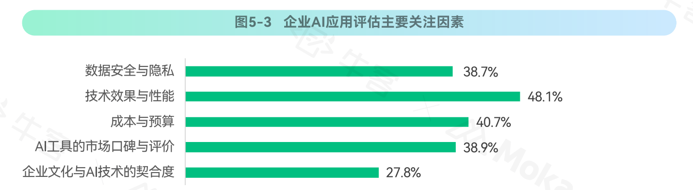 企业在选型AI面试工具时,最关注技术效果与性能(48.1%),其次是数据安全与隐私(38.7%),成本与预算考量位居第三(40.7%)。这种选型逻辑反映了企业从技术好奇到业务实效的态度转变。