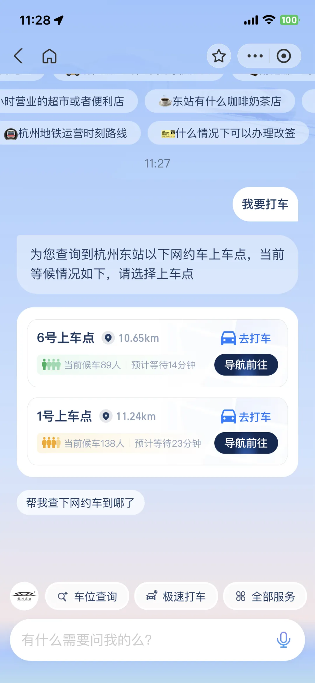 “杭小东”借助 AI 数据分析能力,为旅客提供出租车排队人数、网约车等候时间等实时数据,如旅客下单前可通过其了解不同上车点的等候时长,选择最短等候点以节省时间,在大客流时助旅客合理决策、提升出行效率。