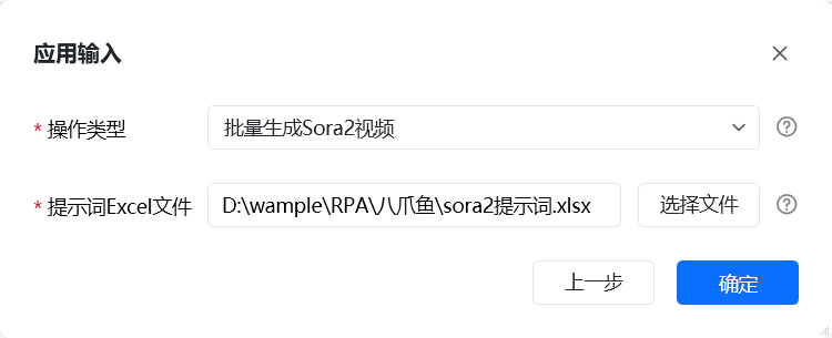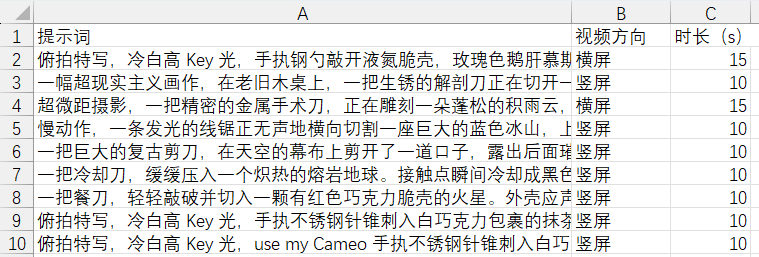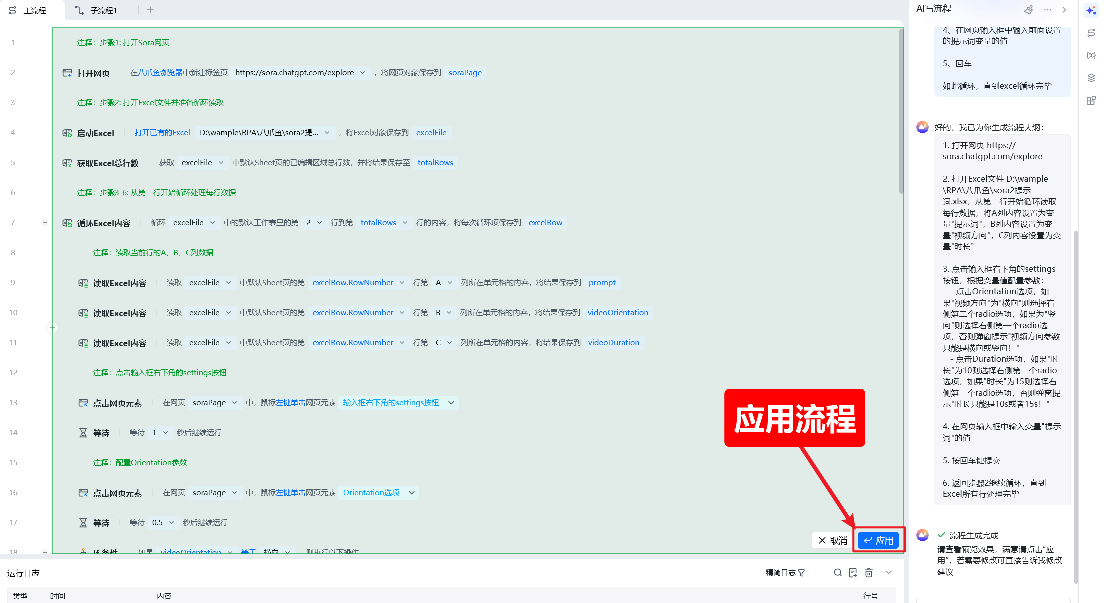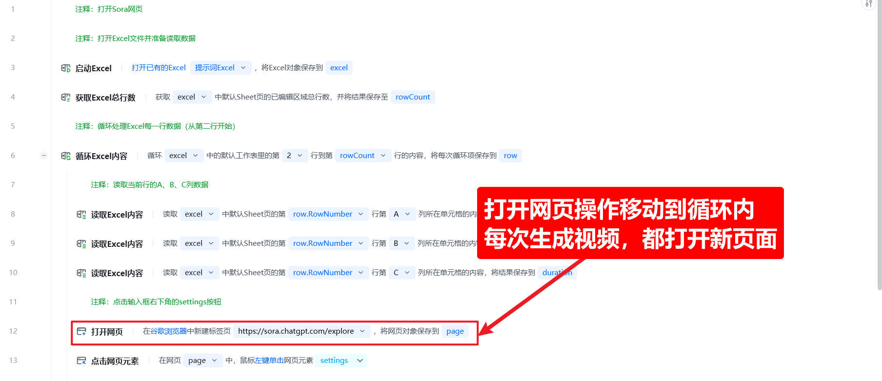 2. 打开Excel文件 D:\wample\RPA\八爪鱼\sora2提示词.xlsx,循环读取每行数据:提取A列内容为"提示词"变量,提取B列内容为"视频方向"变量(横向转换为"Landscap",竖向转换为"Portrait"),提取C列内容为"时长"变量