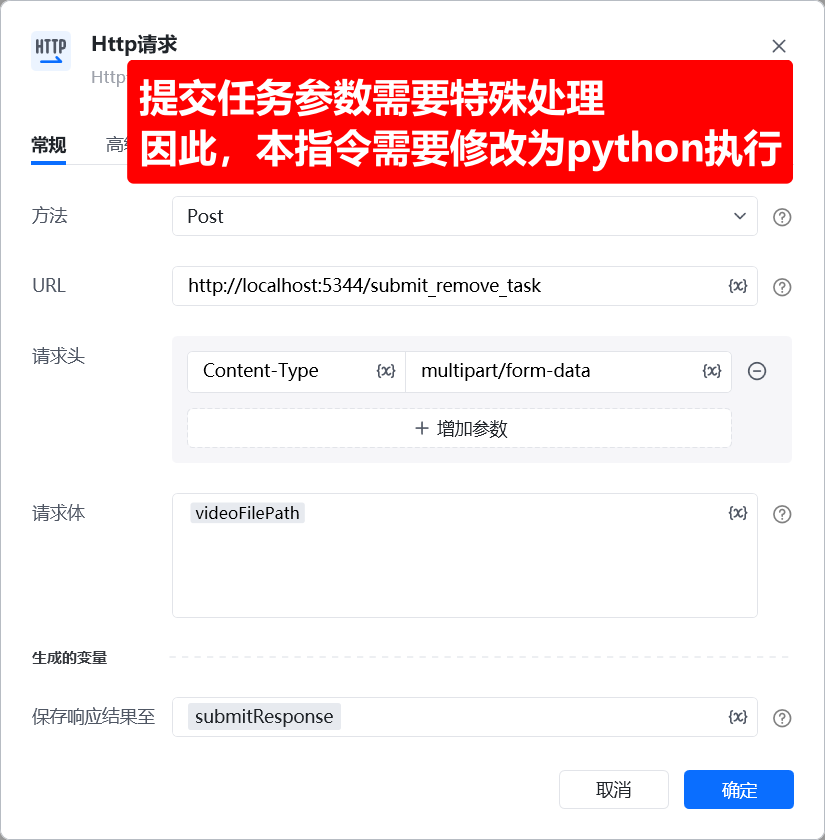 生成的流程中,第一步请求接口是Http请求指令,由于是循环的本地文件批量上传,此处使用python脚本最方便,因此改为使用脚本的形式: