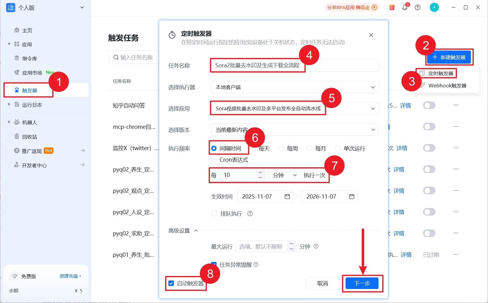 由于Sora2视频一次最多能生成2个视频,想要全自动化批量生成视频,需要借助八爪鱼的定时触发器功能: