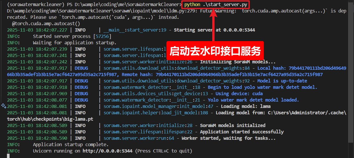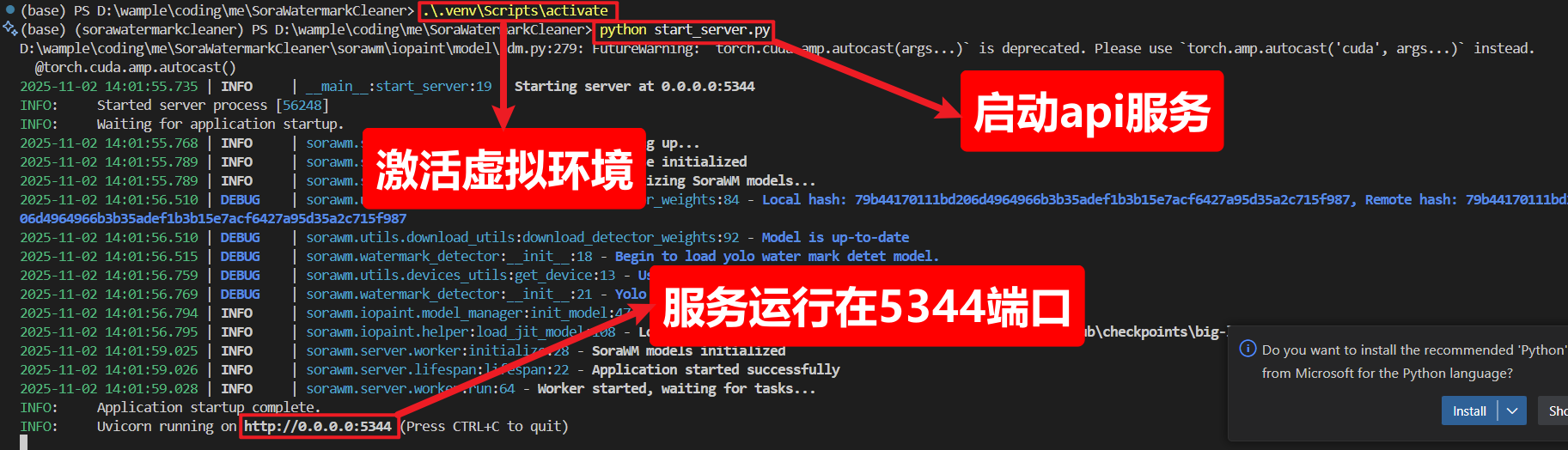 如果是新打开的命令行,需要再次进入项目下,激活虚拟环境,步骤可参考前面的指令,先进入项目,然后激活当前项目虚拟环境,然后执行启动api服务的命令,服务运行在5344端口: