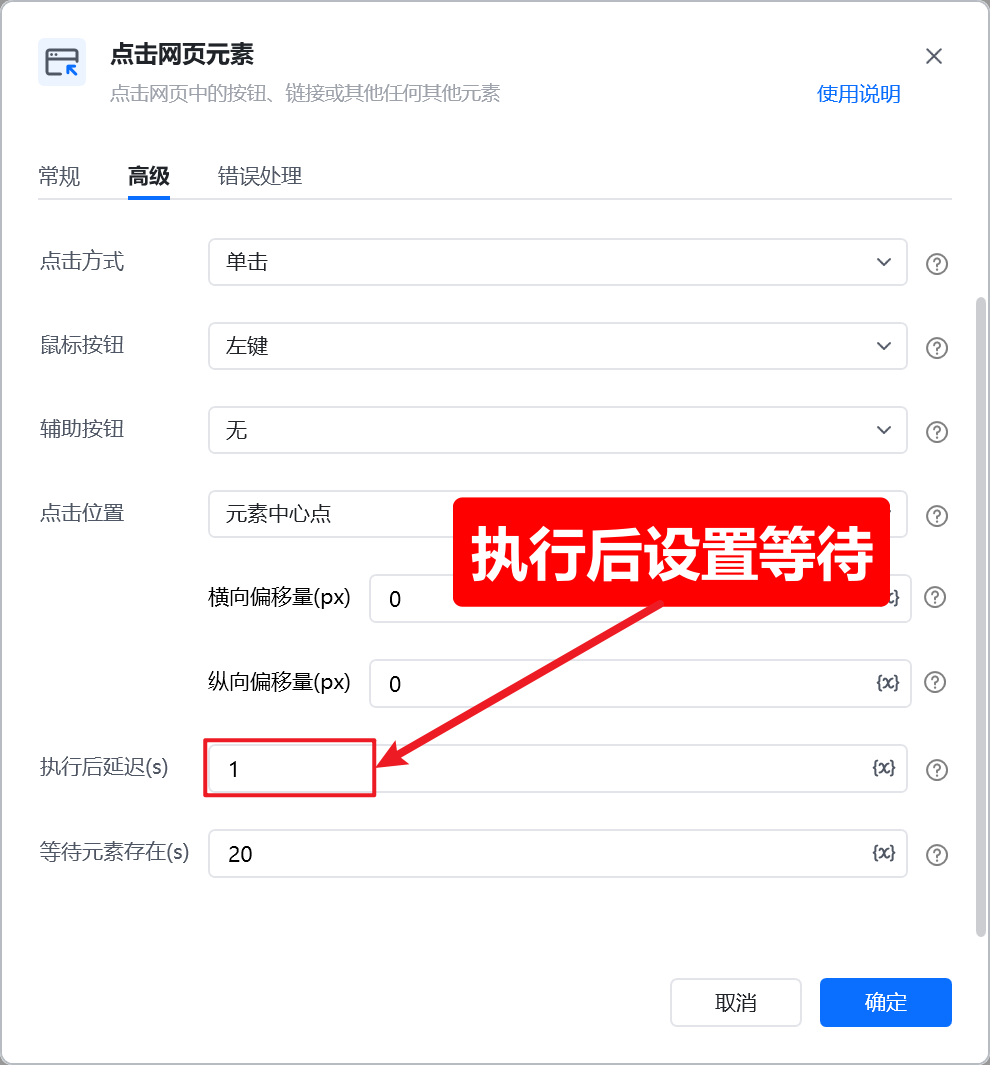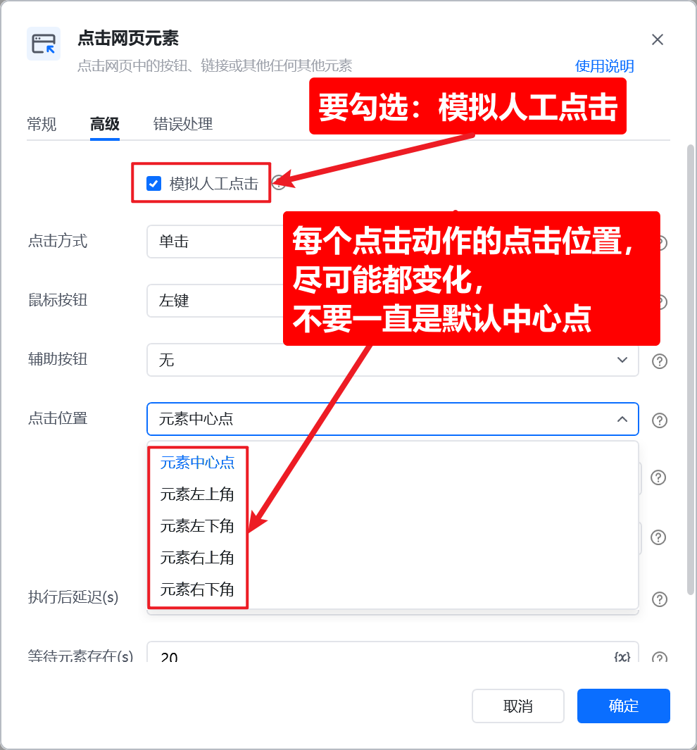 点击操作,都要尽可能随机设置点击位置,勾选模拟人工点击: