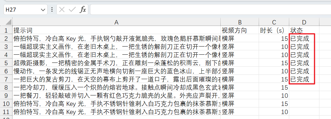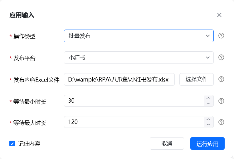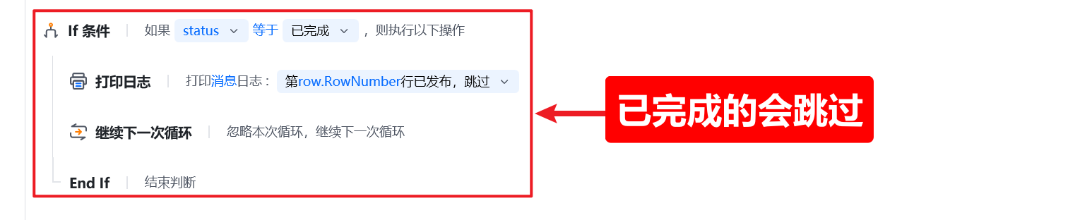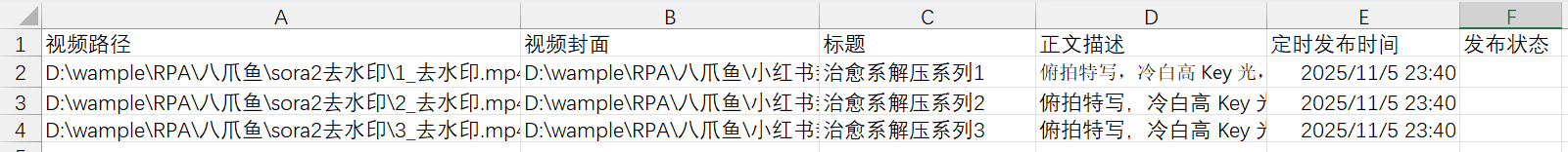 发布状态:不填,流程会在每发布完成一条视频,会写一下该状态为已完成,再次执行,已完成的行回自动跳过
