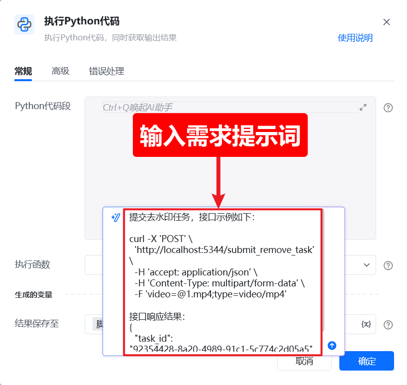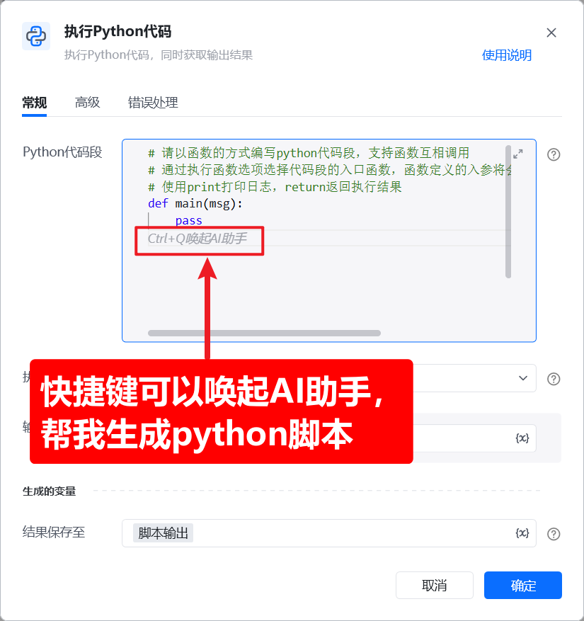八爪鱼的python脚本也是可以用AI来生成的,打开 执行python代码 指令,输入框内可以看到有个提示: