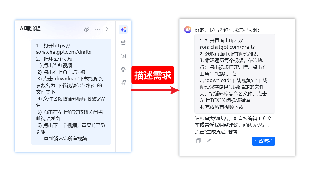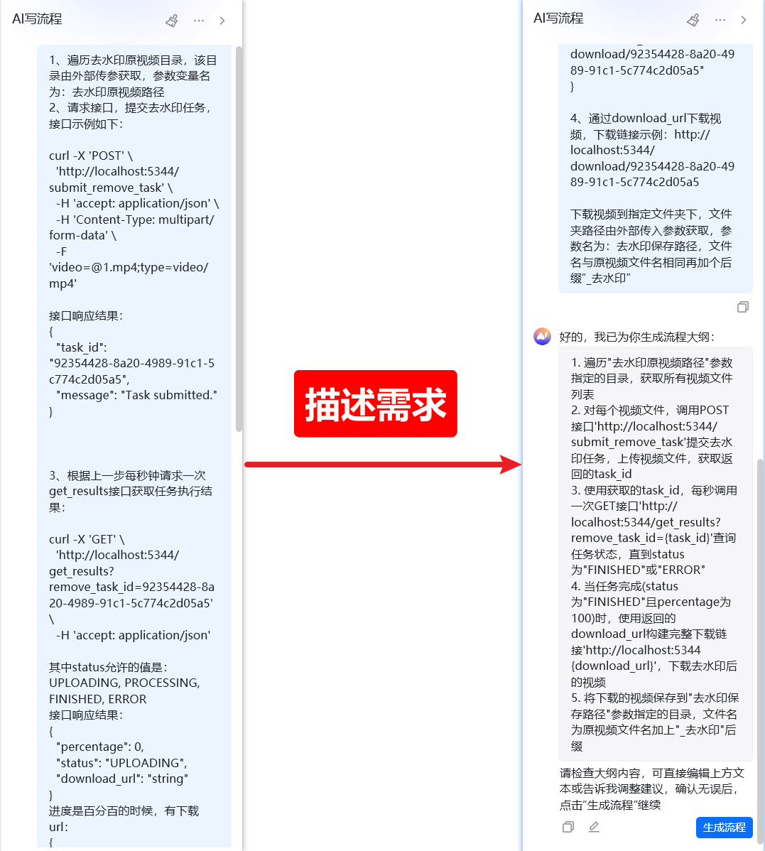 服务在本地5344端口启动后,我们就可以在八爪鱼里,遍历下载好的带水印Soras视频,用接口请求方式,请求本地544端口的接口服务来执行去水印服务,老规矩,还是先写好提示词,让八爪鱼帮我写这些流程: