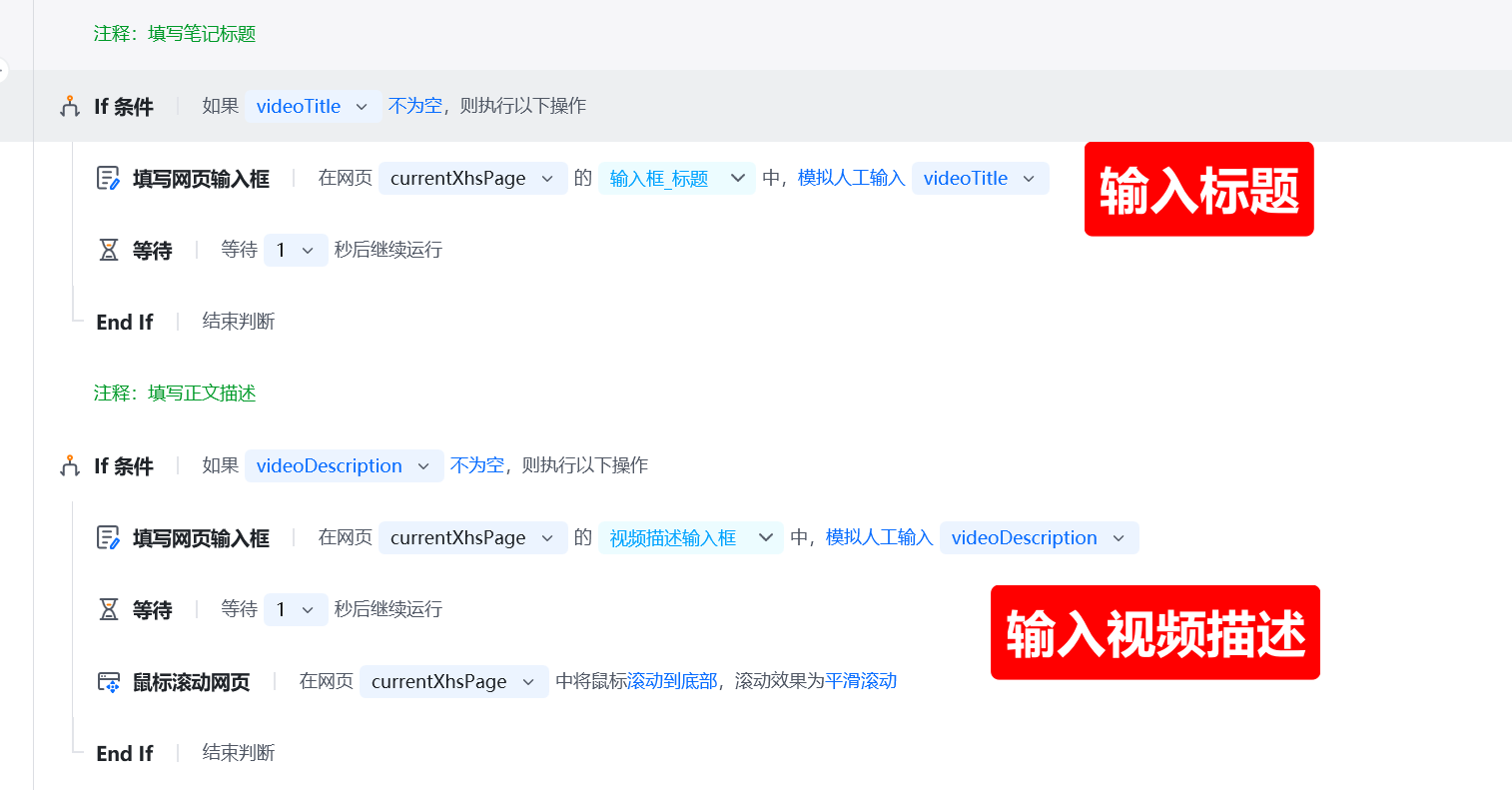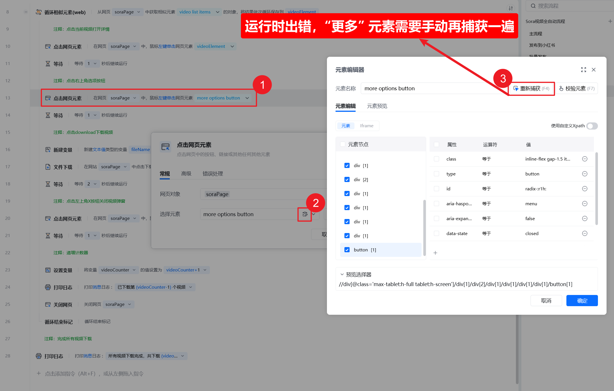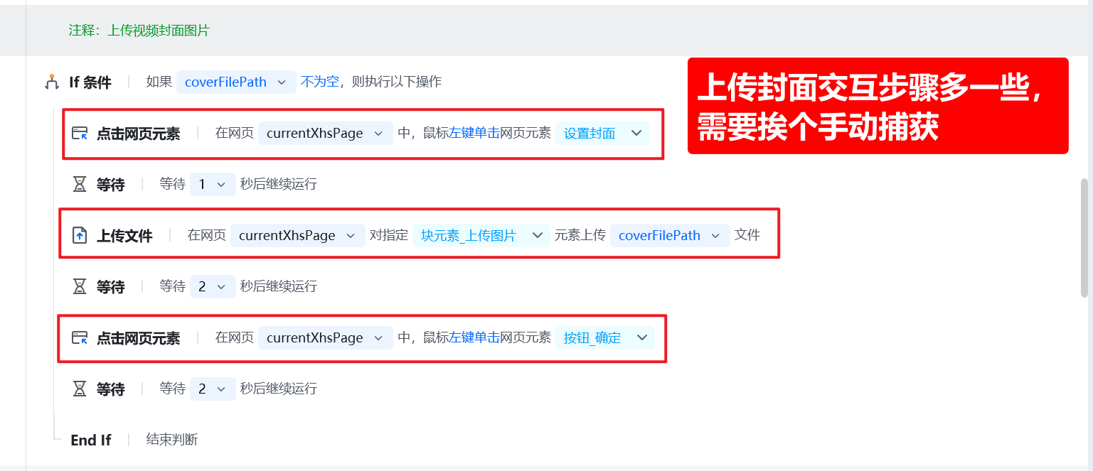 既然过不去,后面的流程其实已经写完,只是由于未经AI实际操作验证,所以默认是注释状态,此时,只能基于现在流程把后面的流程手动打开,把元素捕获完成: