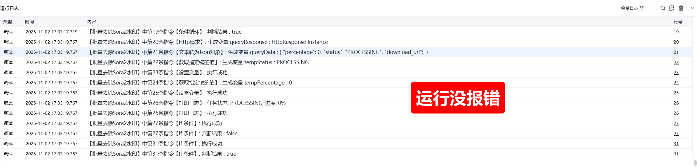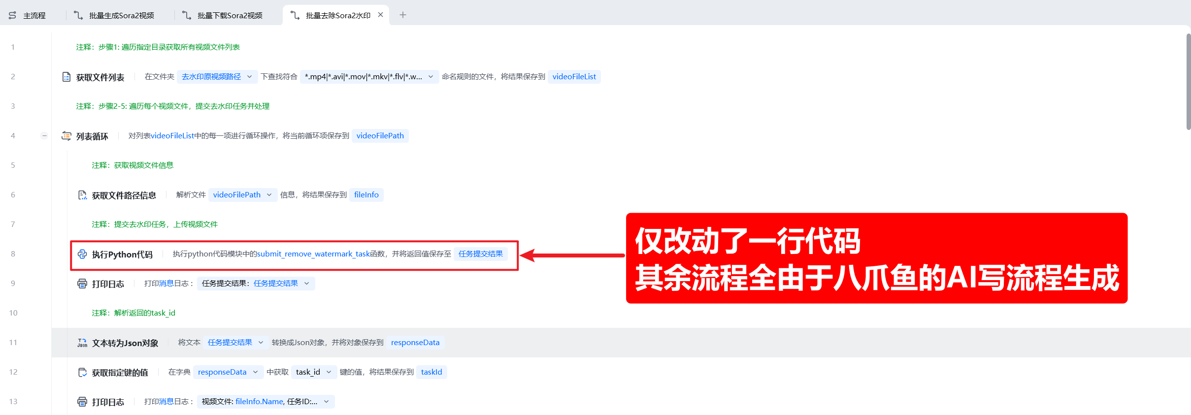 这个流程,我只改了一行指令,使用了更为灵活的python脚本来执行第一个提交去水印任务,剩余的全是八爪鱼的AI写流程功能帮我写玩的,效率杠杠的!