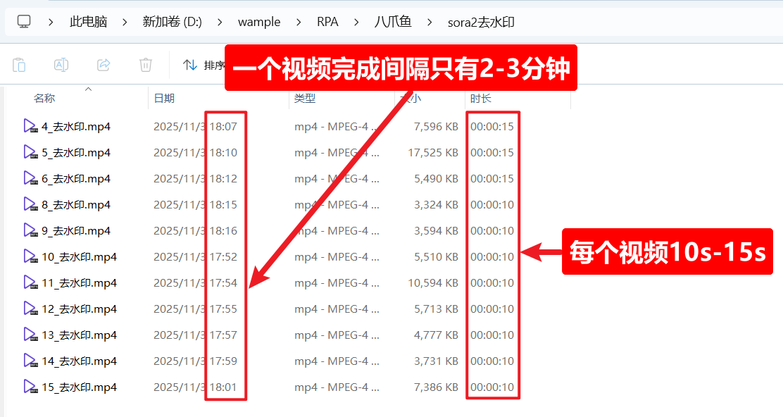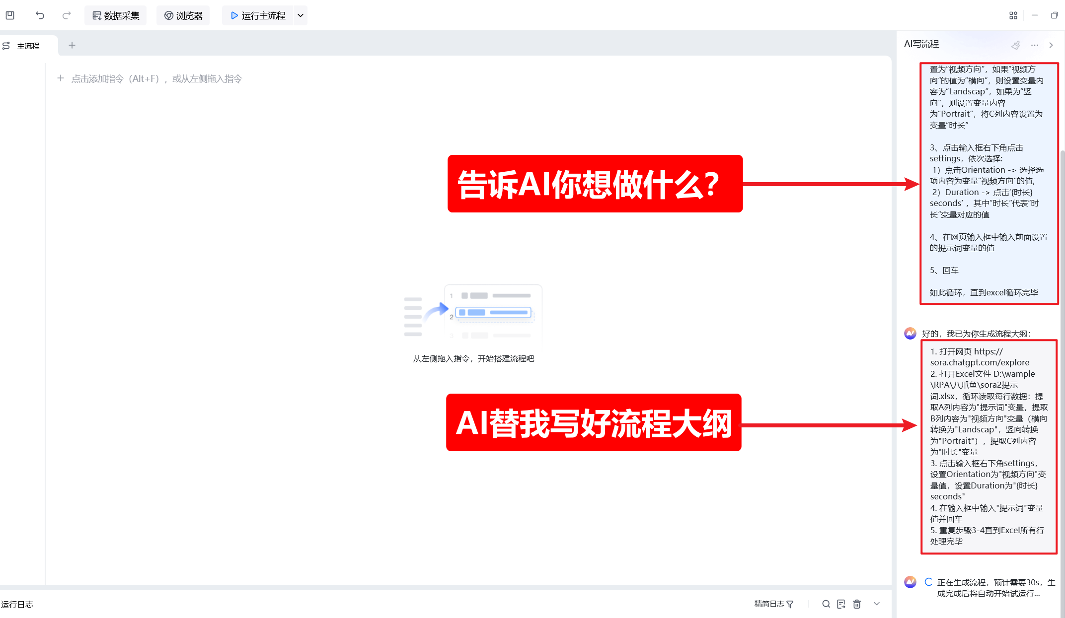 这是一套完整的Sora2视频自动化生产流水线——从批量生成视频、批量下载,到批量去除水印,再到批量发布到小红书,实现了全流程的自动化闭环。这套方案的核心优势在于:基于开源工具,零成本运行,所有数据处理都在本地,保障隐私安全,借助八爪鱼RPA的AI写流程能力,大幅提升操作效率,模块化设计,轻松适配更多视频平台。