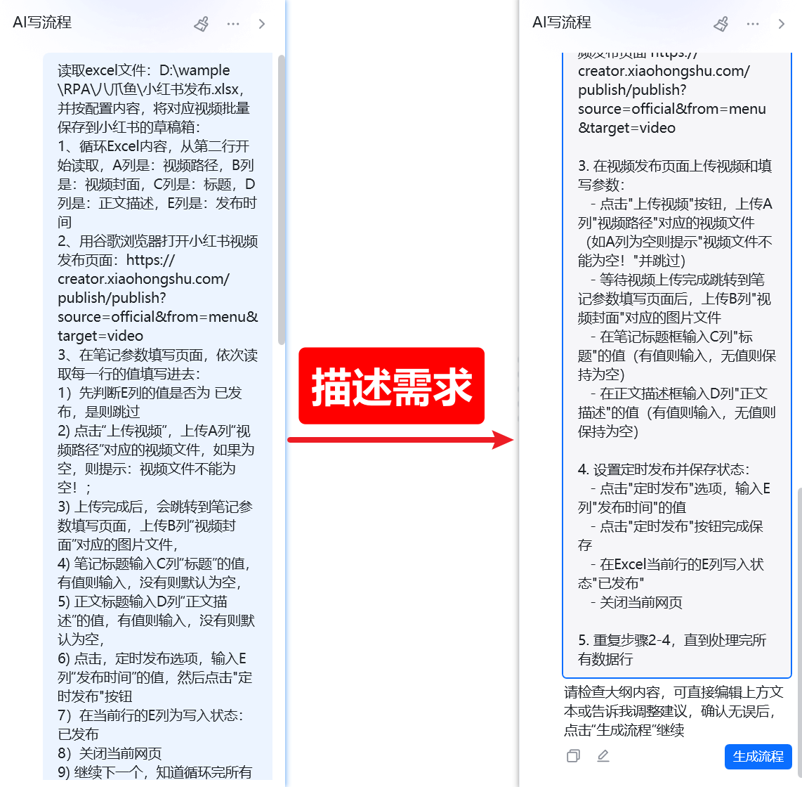 八爪鱼生成的操作流程大纲,看着很清晰,我好想也不需要修改什么,点击“生成流程”,开始帮我写流程:
