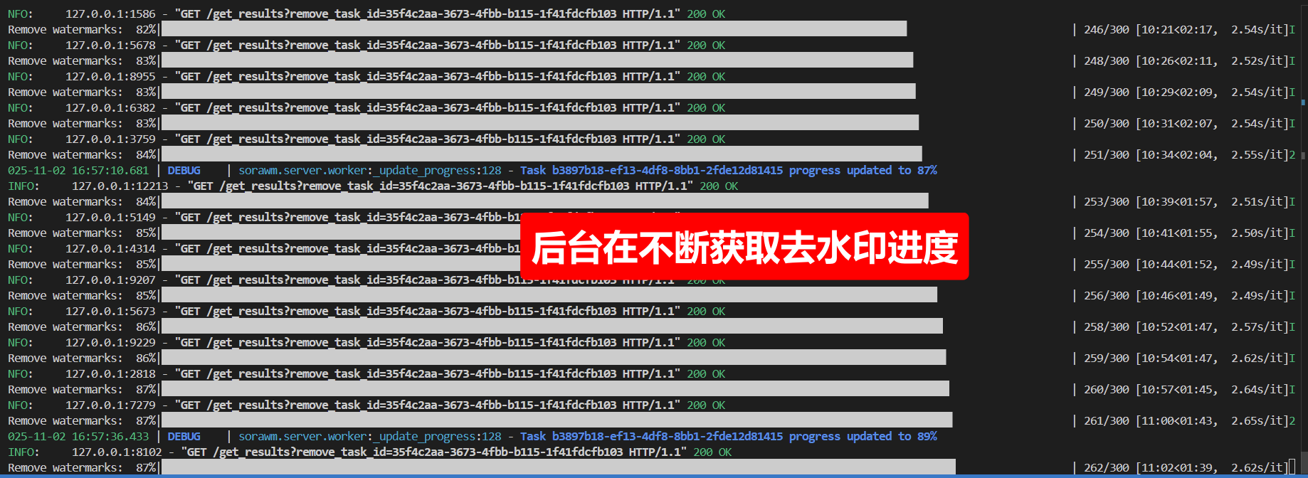 这表明,接口请求是成功的,后台其实已经在执行去水印任务了: