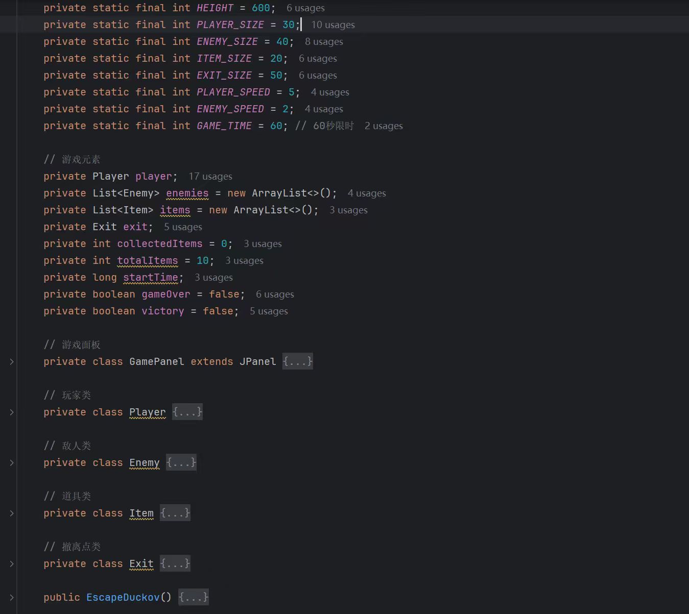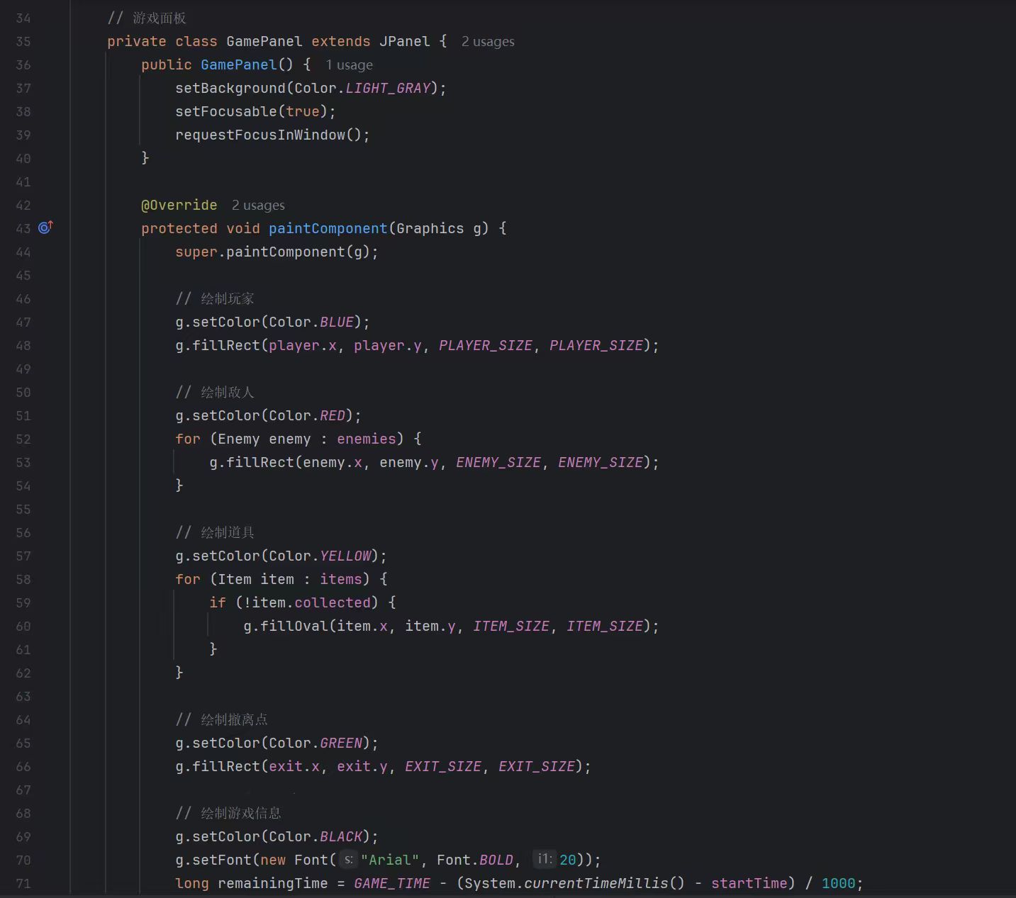 我向 Copilot 提出需求:“用 Java Swing 创建 800×600 的游戏窗口,定义玩家、敌人、道具、撤离点的类,支持键盘控制移动。”Copilot 自动生成了窗口初始化、游戏元素类的基础代码(如Player、Enemy类的属性与构造方法)。
