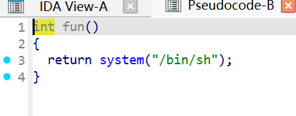 可通过跳转到fun执行/bin/sh来获得shell