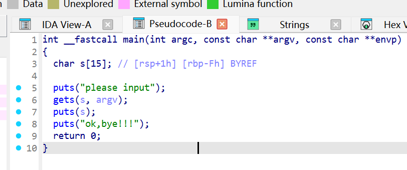 用ida打开,进入main,查看函数,看到gets,存储在s中得知可以通过栈溢出来解题,分析得到s中存储着15个字符