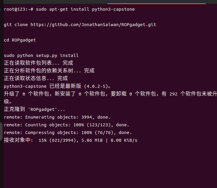 sudo apt-get install python3-capstone git clone https://github.com/JonathanSalwan/ROPgadget.git cd ROPgadget sudo python3 setup.py install