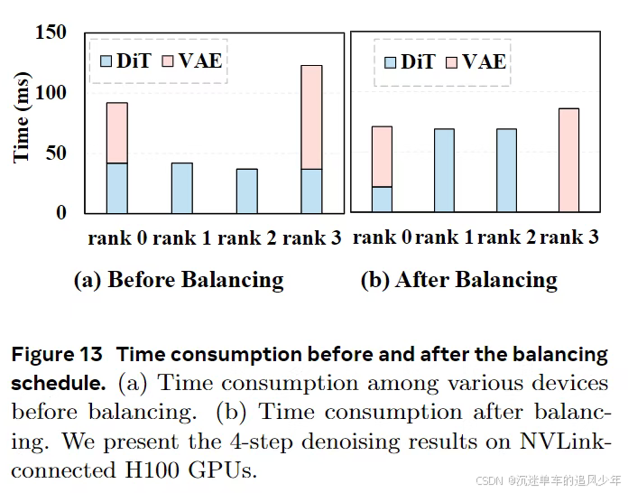 多pipeline编排扩展 (Multi-pipeline orchestration extension) 。为了在多GPU平台上提升系统吞吐量,本文提出了一种可扩展的pipeline编排方案用于并行推理。具体来说,DiT的模块被划分到不同的设备上。如图7所示,每个设备将其输入序列作为一个微步(micro-step)进行处理,并在一个环形结构内将结果传输到下一个阶段。这使得模型的连续阶段能够以pipeline并行的方式并发运行,从而在DiT的吞吐量上实现近线性的加速。