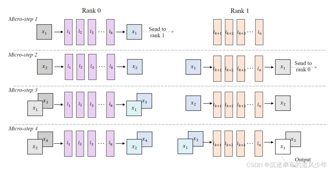 异步通信重叠 (Asynchronous communication overlap) 。为了进一步减少同步停顿,每个GPU都维护两个CUDA流:一个计算流和一个通信流。GPU间的传输是异步执行的,与本地计算重叠以隐藏通信延迟。这种双流设计使每个设备的计算节奏与其通信带宽保持一致,有效地缓解了残余的气泡,并在多GPUpipeline中保持了高利用率。
