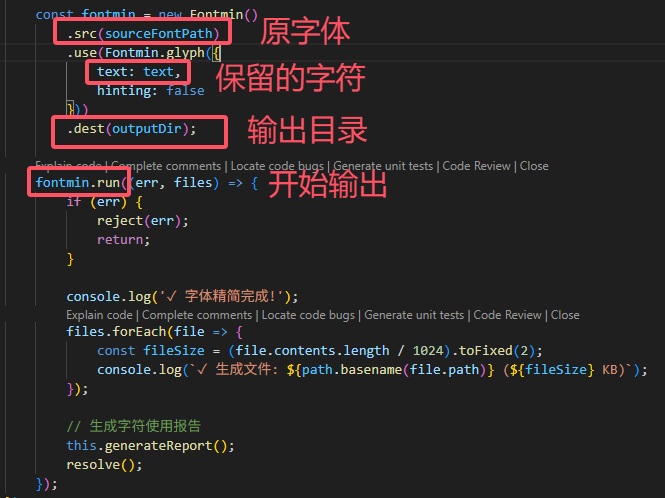 工具的使用也非常简单,通过传入原字体、保留的字符和字体输出目录,最后通过fontmin.run这个API生成即可。