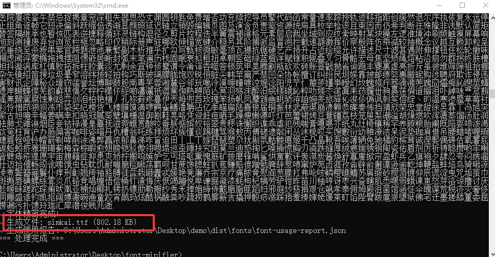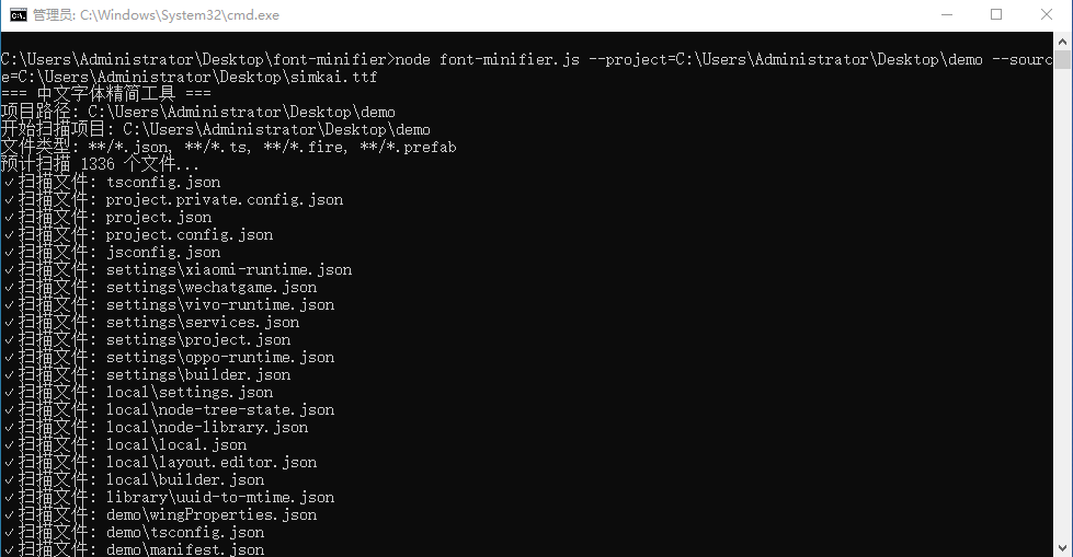 通过node font-minifier.js --project=C:\Users\Administrator\Desktop\demo --source=C:\Users\Administrator\Desktop\simkai.ttf传入工程目录和原字体路径即可。