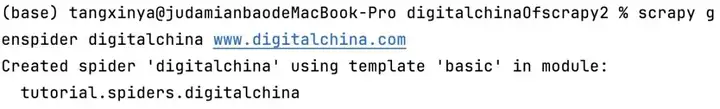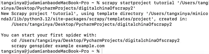 在终端命令行输入scrapy startproject tutorial '路径地址/爬虫文件名称',回车后出现下图信息即创建成功: