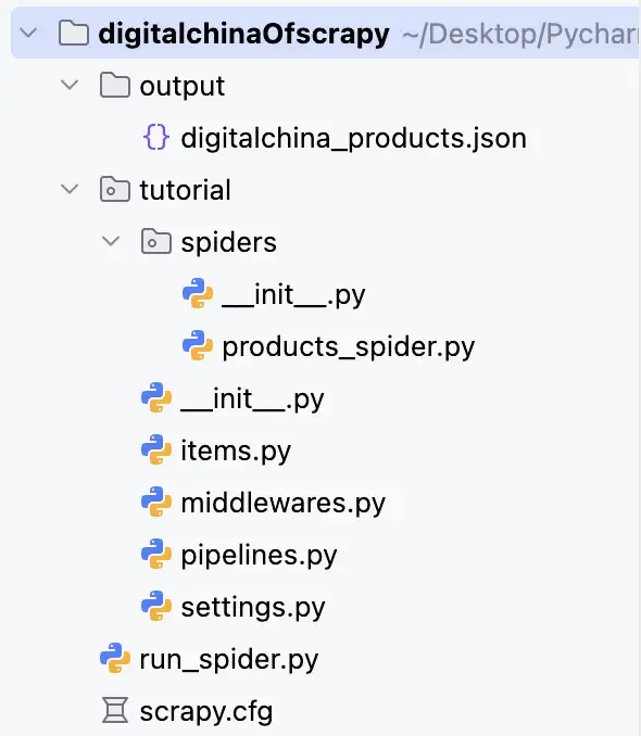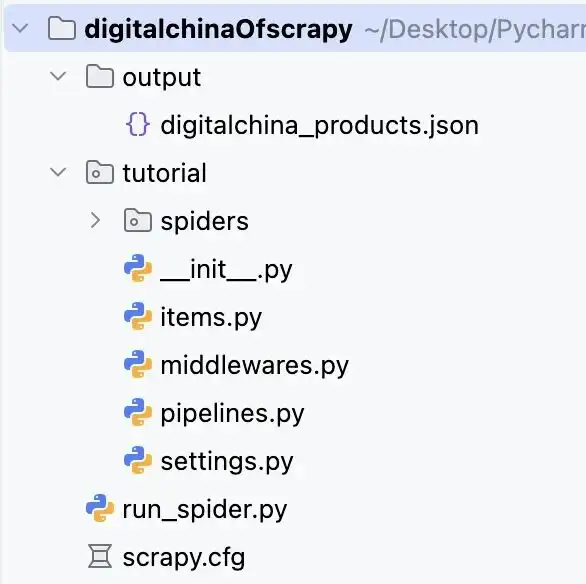 使用IDE打开创建的文件可以观察到scrapy自动分好了模块。