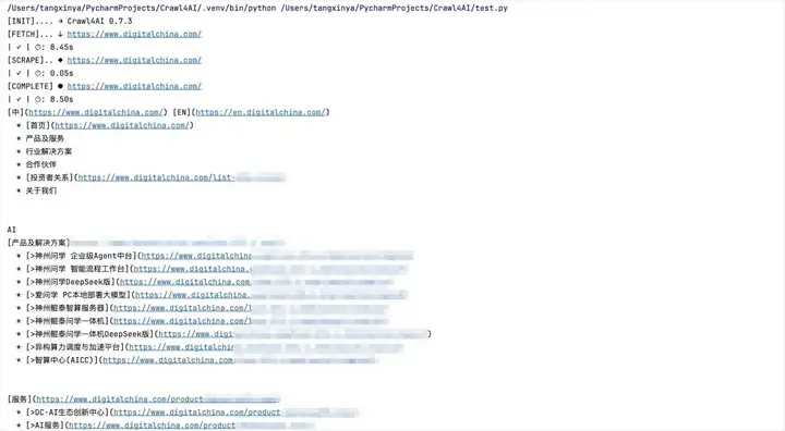 可以看到,代码简化了很多,仅通过提示词crawl4ai便实现了产品及服务的关键信息提取。