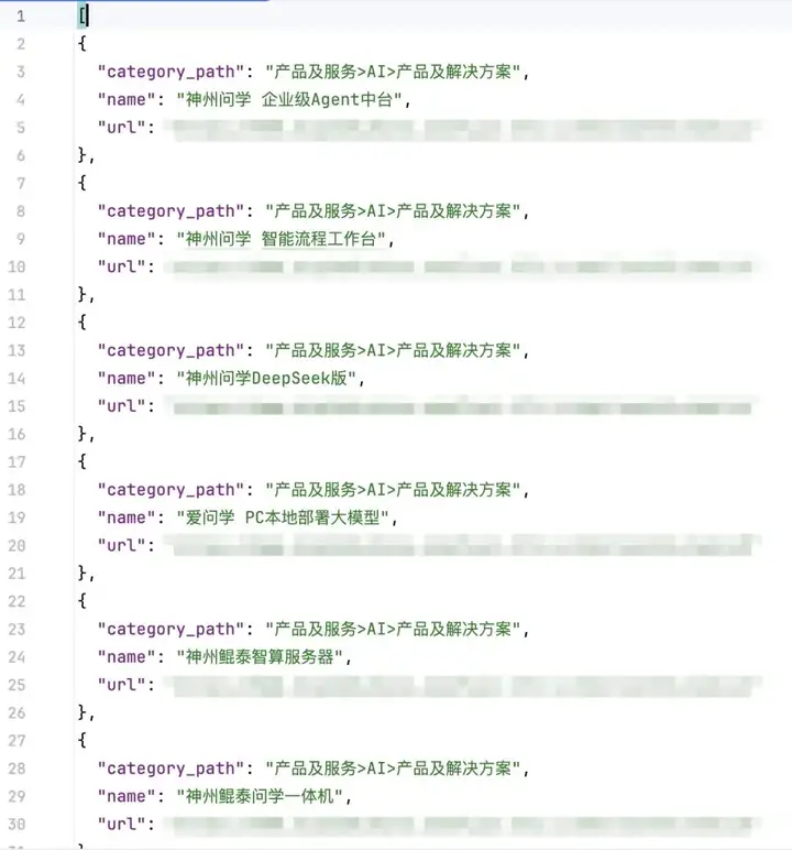 "每个元素包含:category_path(多级分类路径,使用>[大于号]作为分隔符,例如:‘产品及服务>AI>产品及解决方案’)、name(条目名称)、url(完整链接)。"