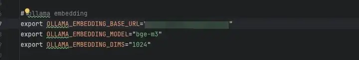 这里按照配置ollama的embeding模型为例,首先使用ollama启动embeding模型,这里选择使用bge-m3,这里因为bge-m3的维度为1024,所以dim写1024,model写模型名称