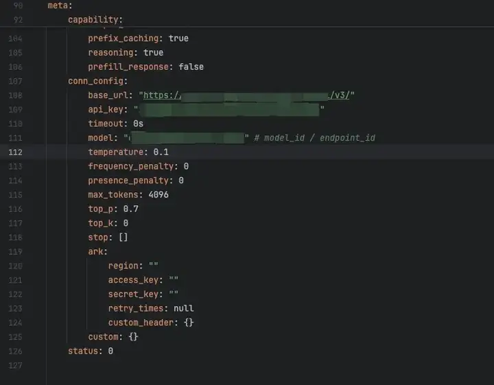 然后将对应的模版文件拷贝到backend/conf/model目录下,然后修改对应配置,这里使用方舟平台的模型不进行额外的模型参数配置,直接修改对应的base_url,api_key,和model3个字段,这3个字段均可以在方舟平台中查询到其中model字段对应的是模型的id