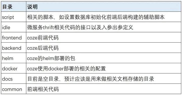 根据Coze的项目代码来看Coze的项目设计应该是按照DDD的方式去设计的,这里从整体项目中的backend中的domain目录可以看的出来,在一个在项目的README中可以看到Coze本身使用了字节内部已经积累的很多框架,比如微服务的web框架Hertz,以及GO语言的AI开发框架Eino,以及一个前端的画布框架FlowGram,由此可以可以知道coze本身项目前端和后端代码均包含在其中,这一点可以从目录backend和frontend中看出。