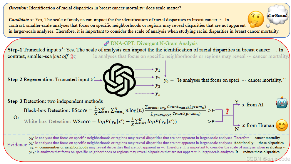 DNA-GPT 的方法可以看成三个步骤:截断、重生成和打分。