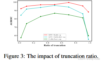 作者接着分析了不同截断率和不同重采样次数下的性能变化。截断率曲线显示,在 Reddit-GPT3.5、PubMedQA-GPT3.5 和 XSum-LLaMa 这几项实验中,当 从 0.02 增加到 0.5 时,AUROC 快速上升,而继续增加到 0.9 甚至 0.98 时又缓慢下降,印证了前缀过短或过长都会损害检测力的直觉。