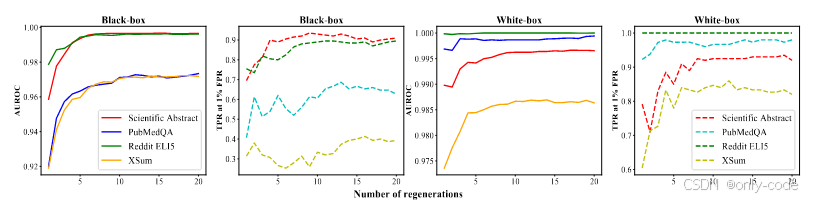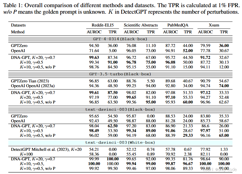 白盒检测的结果更为极端。对 text-davinci-003,DetectGPT 在 Reddit、新摘要、PubMedQA 和 XSum 上的 AUROC 只有 50%–80% 左右,TPR 基本接近 0%,说明其对最新模型和新数据的适应性较差。而 DNA-GPT 的 WScore 在同样场景中,AUROC 接近 1,TPR 大多在 90% 以上;某些配置下甚至出现了“100% TPR @ 1% FPR”的近乎完美表现。这说明基于“自重采样 + 似然比”的白盒版本非常强,只是受限于真实世界中 logprob 接口的逐渐收紧。
