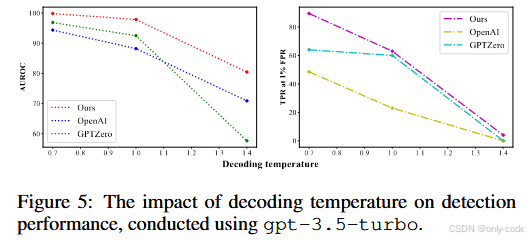 在温度敏感性实验中,作者将 GPT-3.5-turbo 的解码温度从 0.7 调高到 1.4。在 Reddit 数据上,无论 GPTZero 还是 OpenAI classifier,都随着温度升高出现了显著的 AUROC 和 TPR 下降,这可能是因为它们的训练数据集中,大多数 AI 文本是用默认或较低温度生成的。一旦生成策略偏离训练分布,分类器便难以适应。DNA-GPT 的性能同样有所下降,但始终保持明显领先;在温度高到 1.8 时,生成文本本身已变得胡言乱语,论文举了几个例子展示这种“乱码式”输出,很难想象真实用户会保留这样质量的文本。