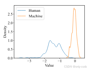 在概率空间里,作者提出了“似然差距假设”,即在相同前缀 (X) 下,机器生成的余下文本在模型自身的 log-likelihood 意义上,平均要比人类续写高一个显著的常数。直观理解是:GPT 的生成过程本质上是“尽量选概率大的下一个词”,而人类写作并不会严格做这种最大化,有时会主动选更罕见的表达,或者按结构、修辞需要重组语言,从而在模型眼里“似然更低”。