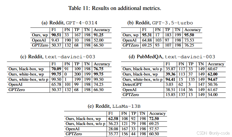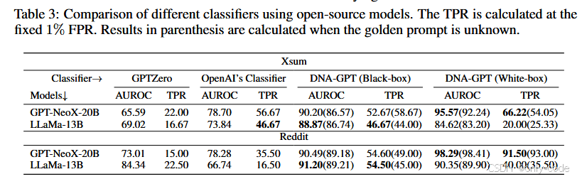 在开源模型实验中,作者对 LLaMa-13B 和 GPT-NeoX-20B 生成的数据重复了上述分析。训练型检测器在这些模型上的 AUROC 和 TPR 普遍偏低,说明其训练集几乎没有覆盖这些模型的输出风格;DNA-GPT 则在大多数组合上表现优于基线,尽管在部分任务上白盒得分略有下降。