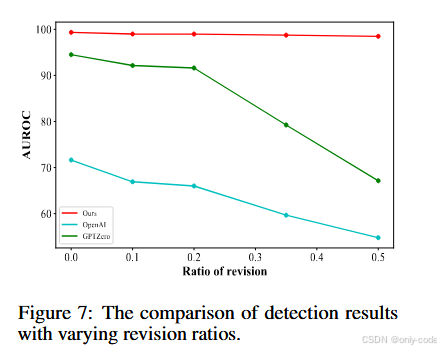 针对改写鲁棒性,作者借鉴 DetectGPT 的设置,用 T5-3B 模型在 GPT-4 生成的 Reddit 答案中随机替换一定比例的 5 词片段,模拟“被另一模型或人工改写”的场景。当改写比例从 0 到 50% 提升时,GPTZero 和 OpenAI classifier 的性能一开始略有下降,随后在改写超过 30% 后几乎崩溃;DNA-GPT 的 AUROC 则从 99.09 微降至 98.48,TPR 也保持在较高水平,整体表现非常稳健。